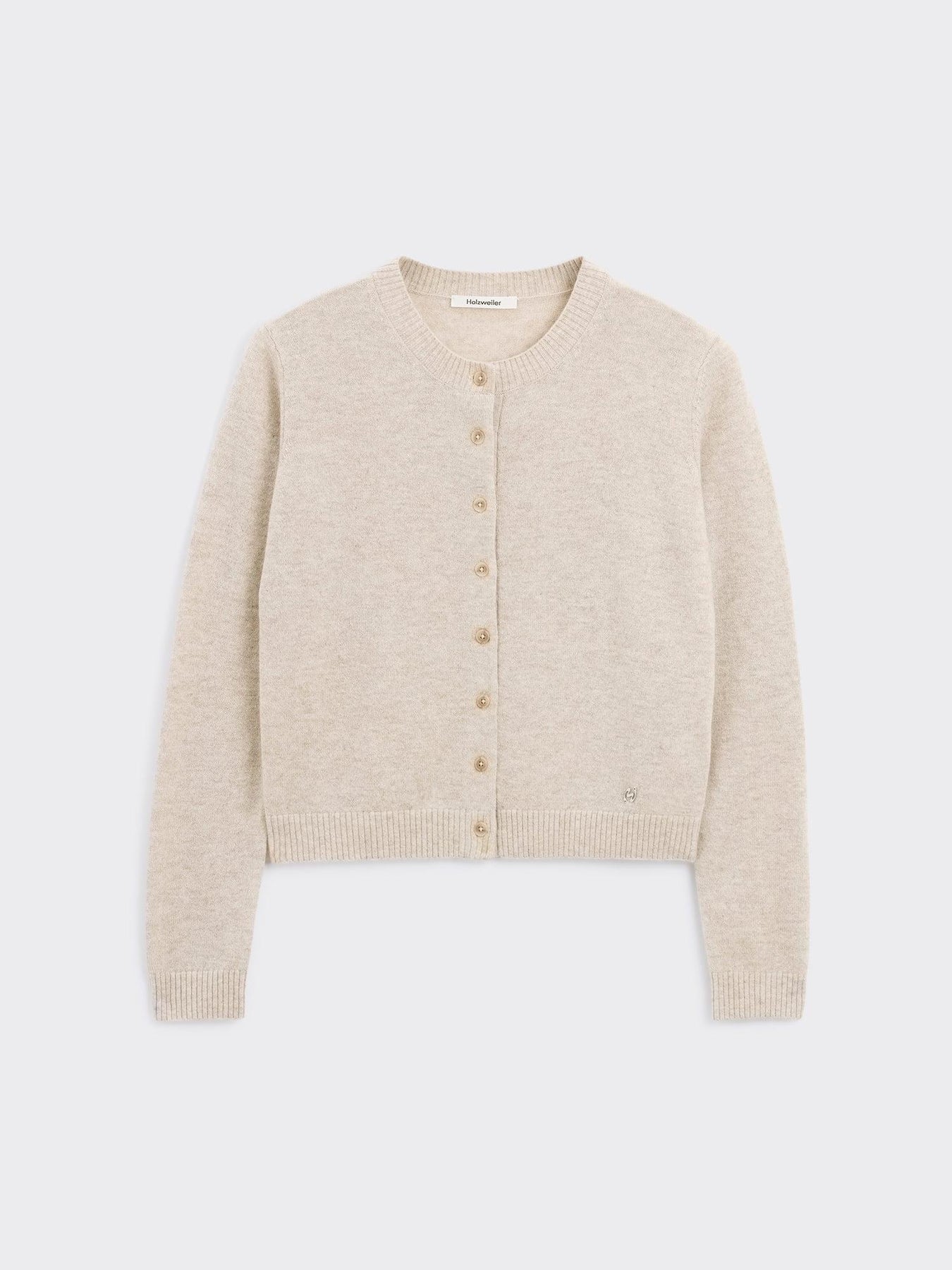 W. Cashmere Cardigan 26-01 er en elegant og tidløs cardigan laget av finstrikket kasjmir. Den har rund hals, knappelukking foran og ribbestrikkede kanter, noe som gir en sofistikert finish. Den er også dekorert med et avtagbart metalllogo-emblem over midjen, som tilfører et unikt preg.