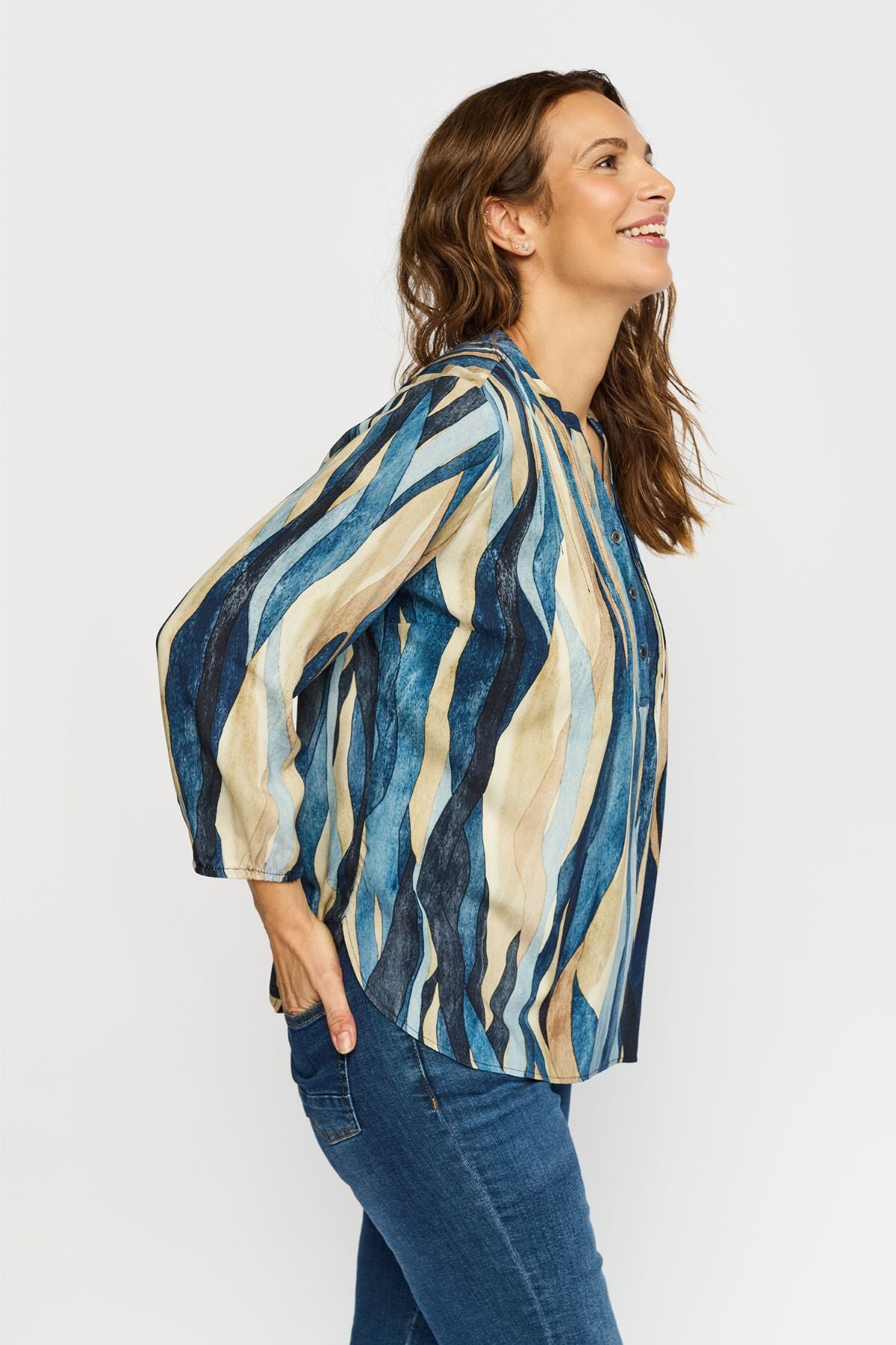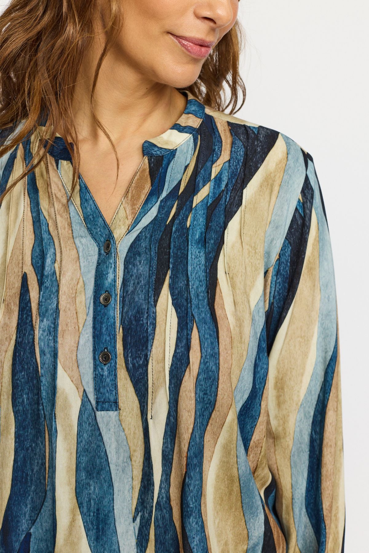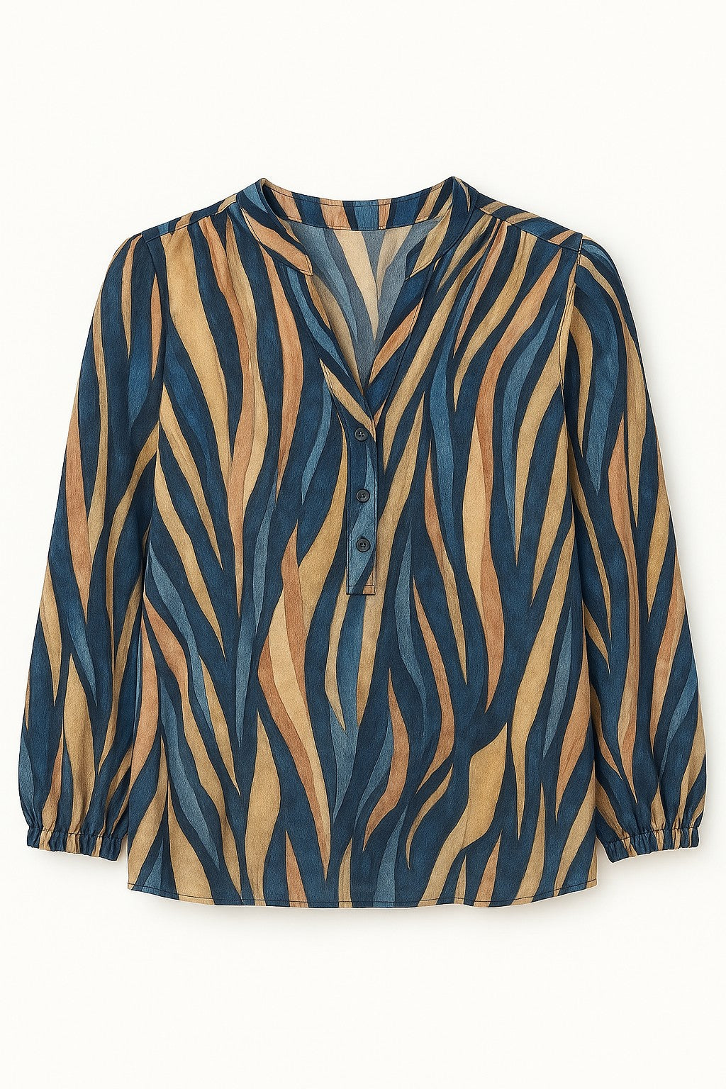 Elegant bluse med V-hals og knapper, designet for en feminin silhuett. Den har pleats ved brystet og trekvartlange ermer med elastiske avslutninger, noe som gir en behagelig passform. Perfekt for en avslappet, men stilfull look.