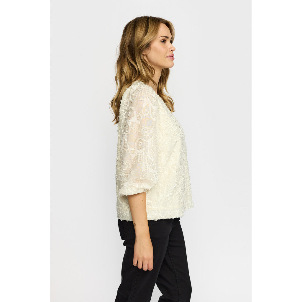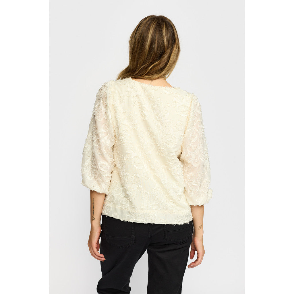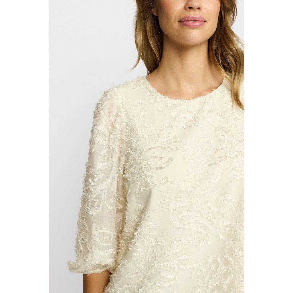 Blouse in structured fabric with short balloon sleeves and a round neckline.