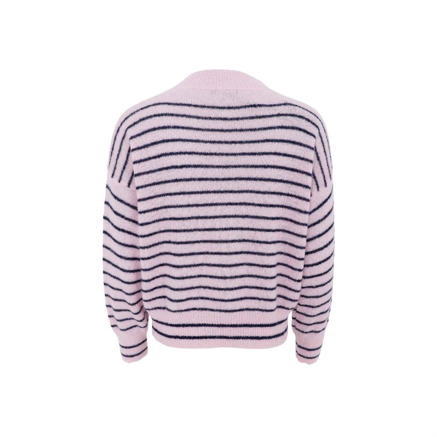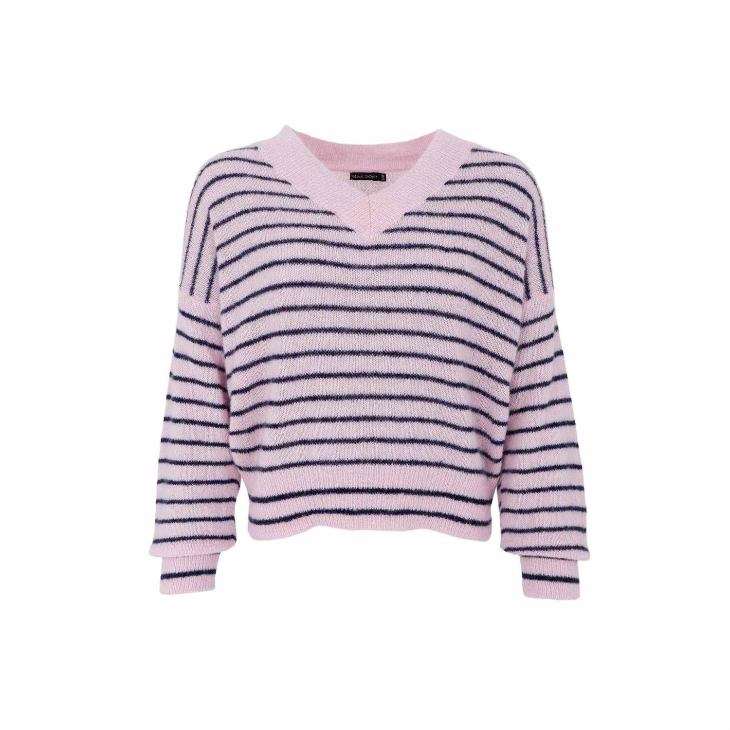 Stripet strikkegenser med V-hals i myk ullblanding. Genseren har et tidløst stripemønster og en avslappet passform som gjør den både komfortabel og enkel å style. Den myke ullmiksen gir god varme uten å føles tung, perfekt for kjøligere dager. V-halsen gir et feminint og flatterende uttrykk som passer like godt til jeans som til skjørt.