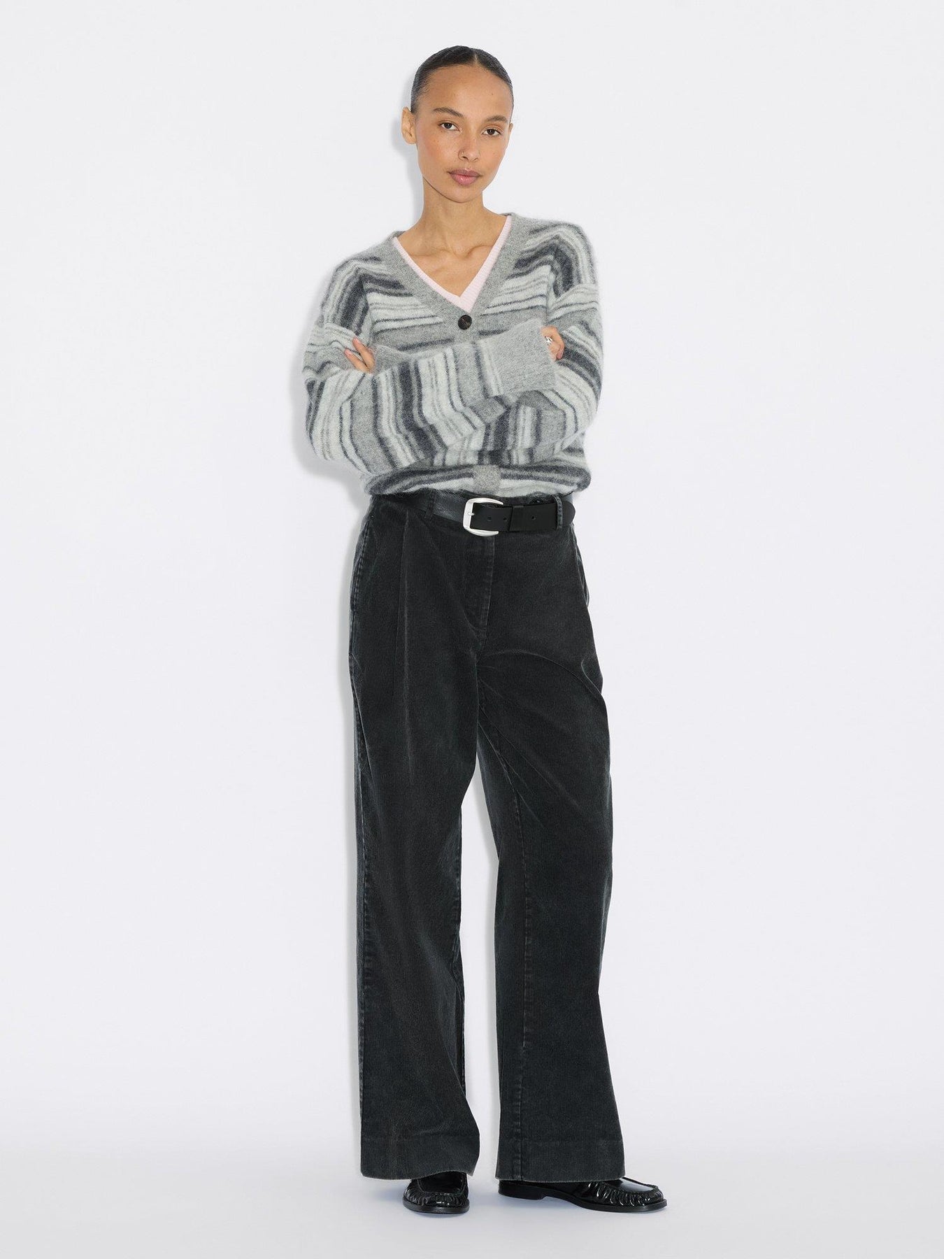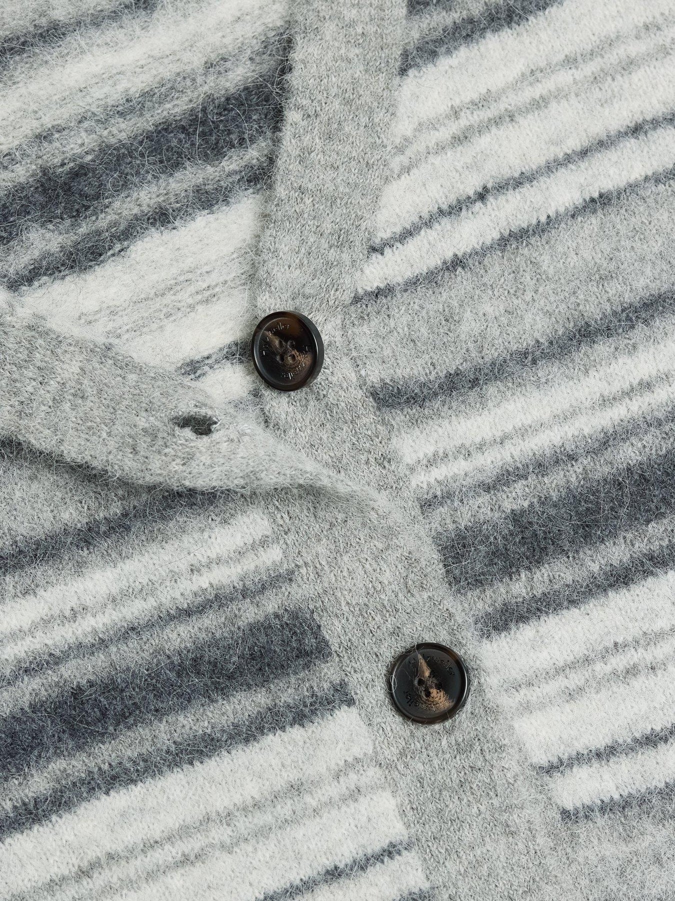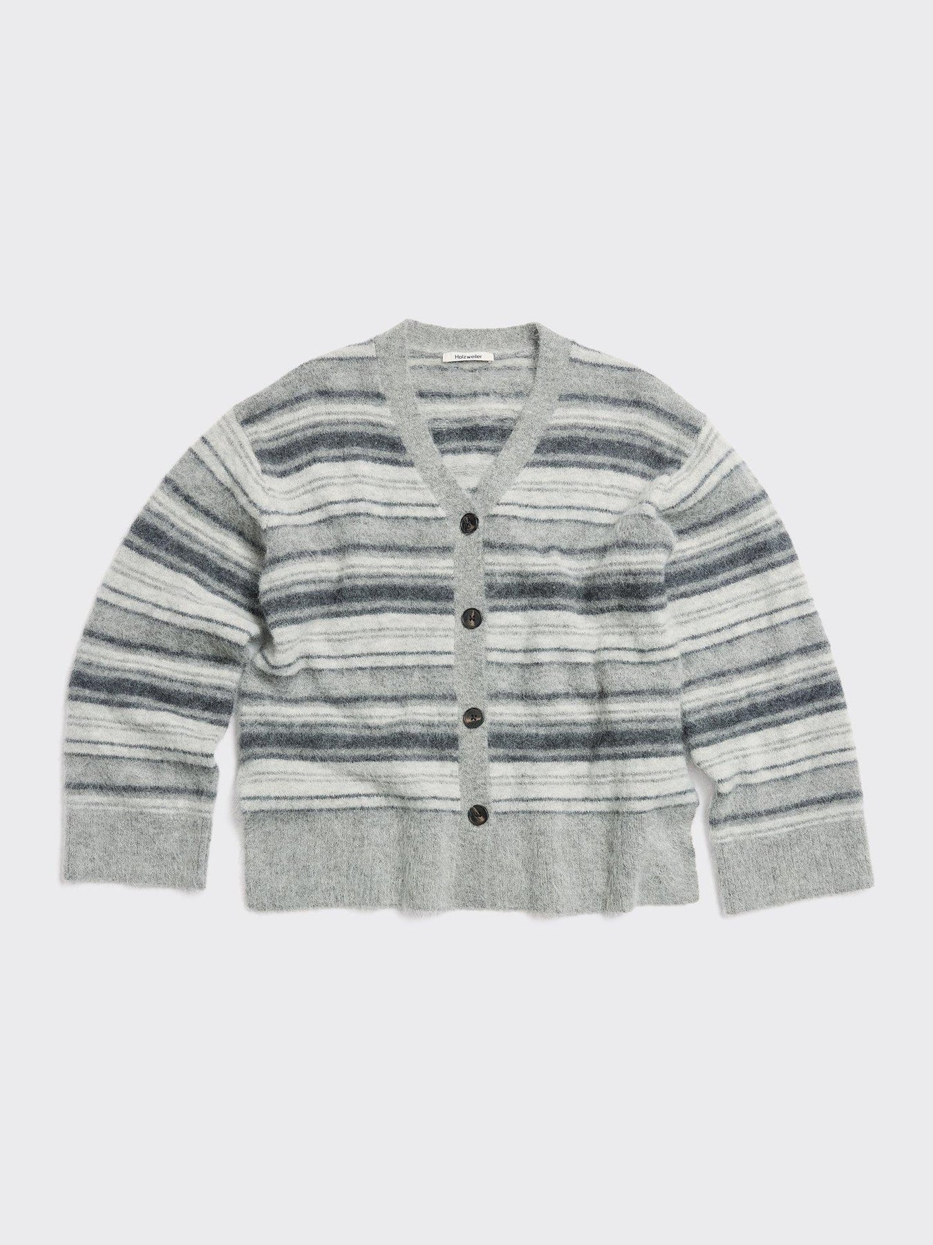 Fluffy Stripe Cardigan er en stilfull og komfortabel cardigan som tilfører et mykt preg til enhver garderobe. Den gråstripete designen gir et moderne uttrykk, perfekt for hverdagsbruk.