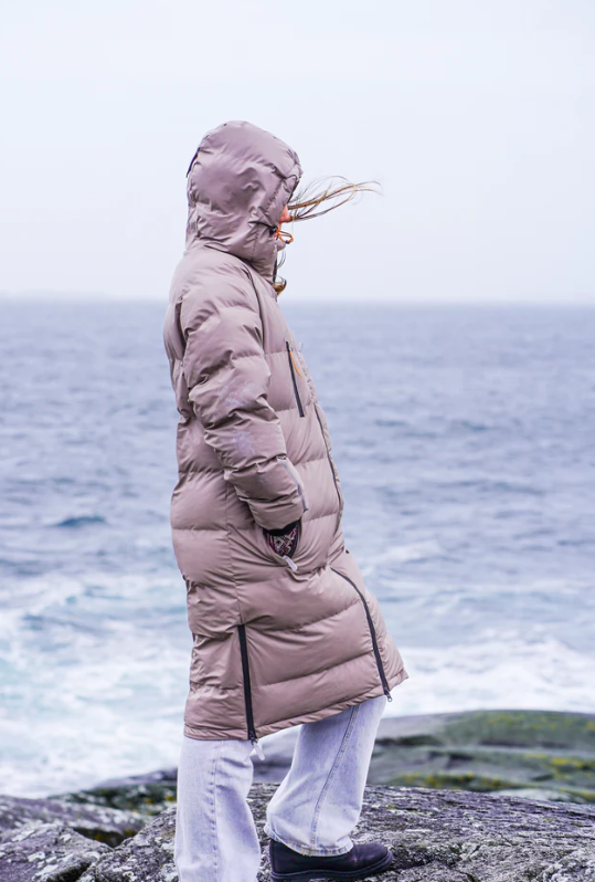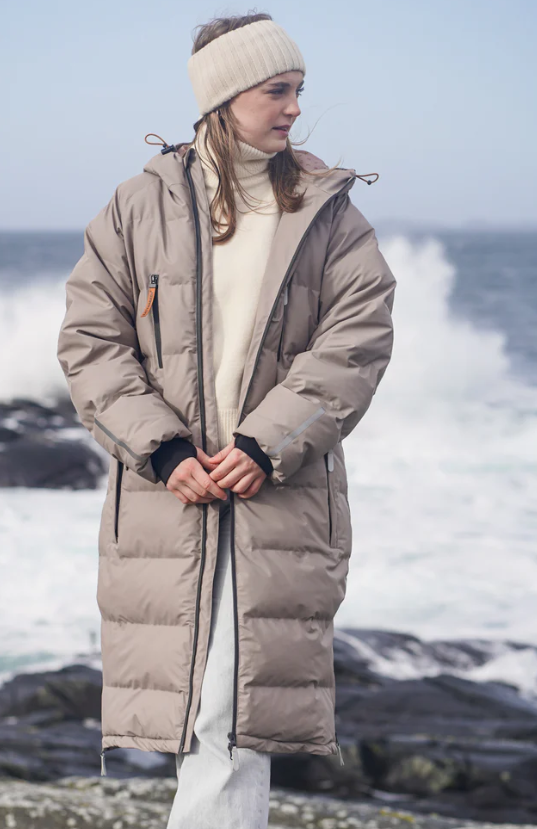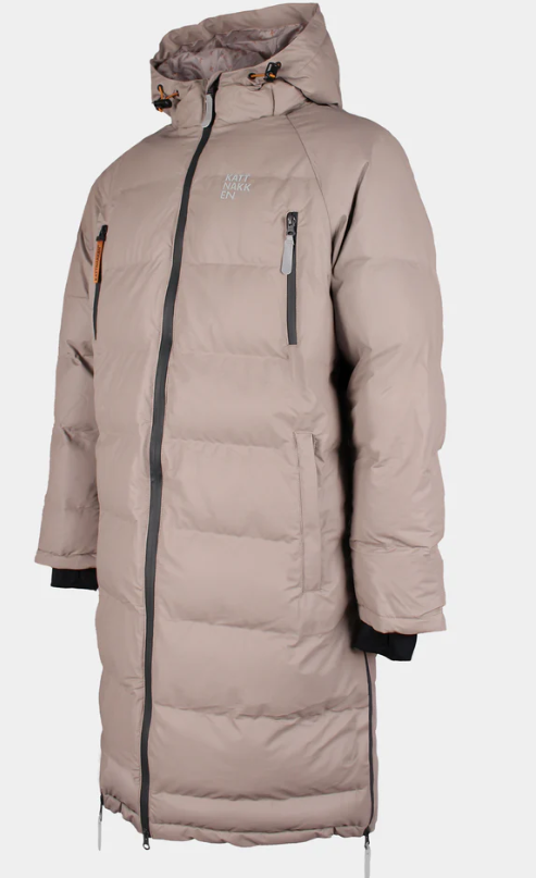 Laga i PU materiale og ei vannsøyle på 10 000 mm. Desse er heilt vanntette der regnet prellar av stoffet. Kåpene har vattering i form av kunstfiber så her kan du halde deg varm og heilt tørr når hausten sett inn for fullt. Det syntetiske foret held på varmeevna når det blir vått, i motsetning til dun, og sidan dette er ei regnjakke har me valt bort dunet. Kåpa er slitesterk og kan vaskast som vanleg PU-regntøy utan å miste form og funksjon. I tillegg tørkar syntetiske materialar raskare enn naturleg dun, noko som er ideelt når PU-stoffet ikkje skal i tørketrommelen. I tillegg har kåpa sjølvsagt teipa og sveisa saumar.