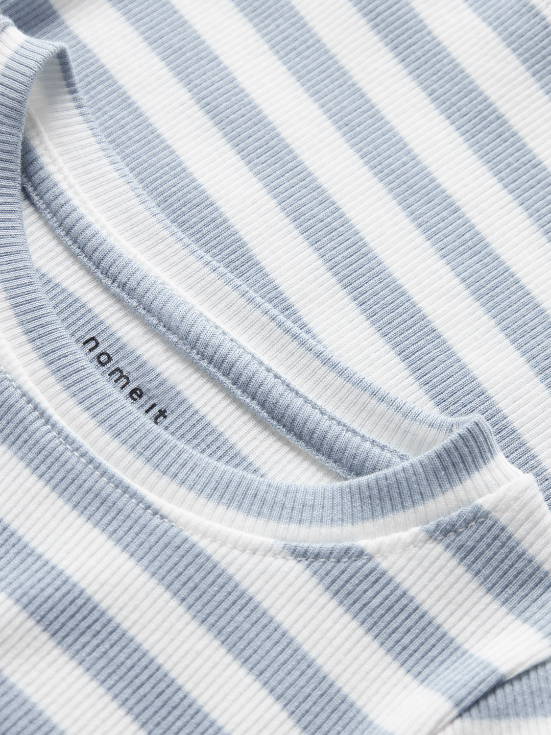 Oppdater barnets garderobe med denne stilige og komfortable toppen. Den ribbestrikkede designen med vertikale striper gir en tidløs look, mens den gode elastisiteten sikrer en behagelig passform. Perfekt for hverdagsbruk.