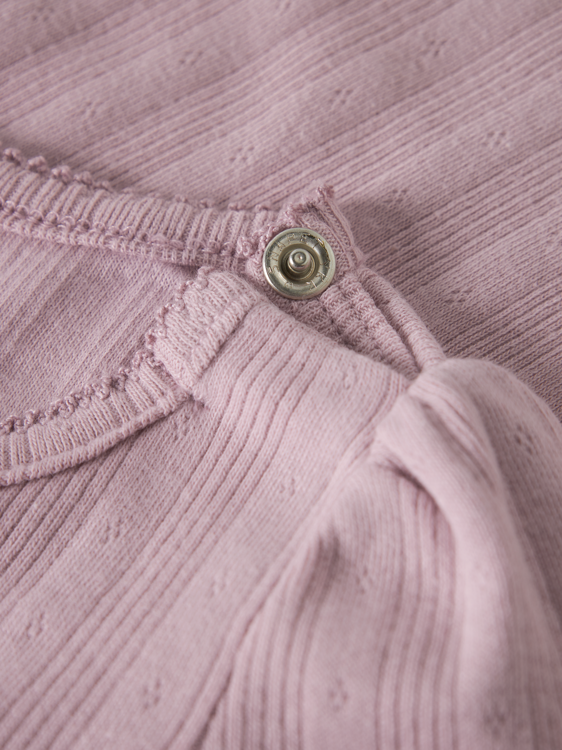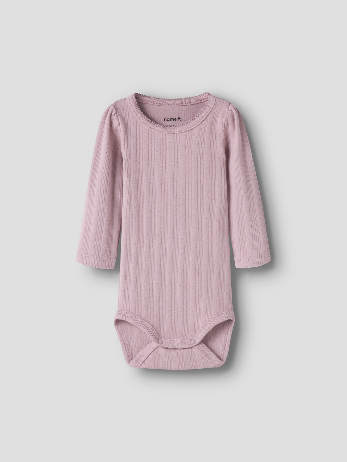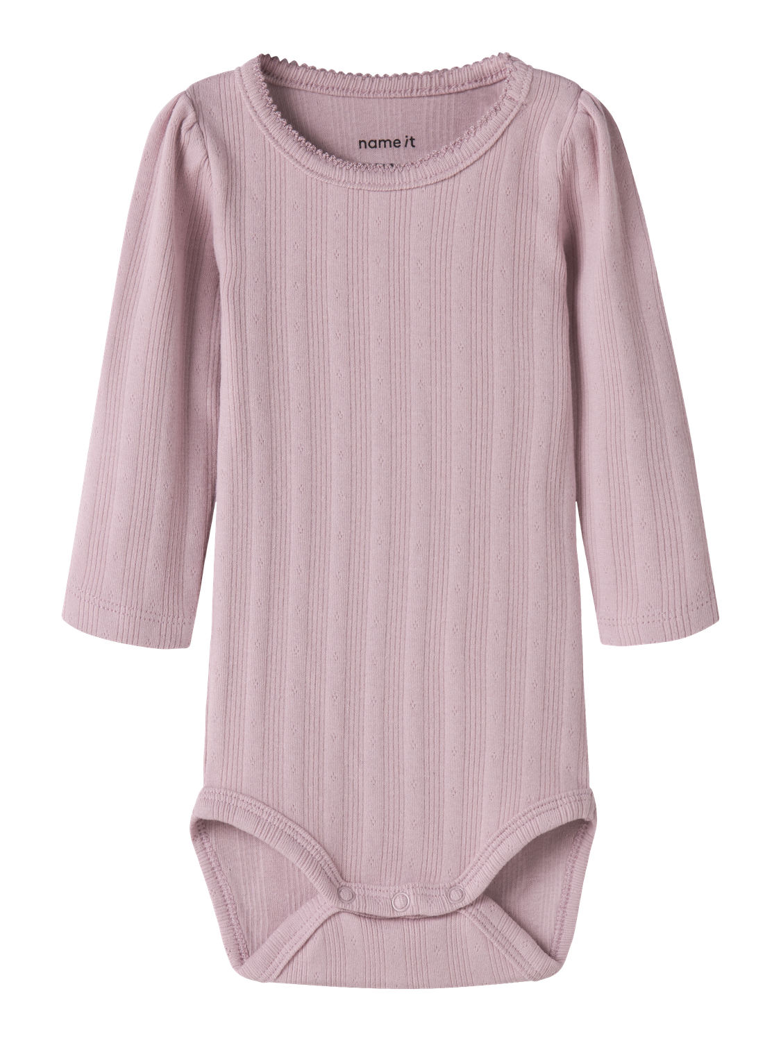 Oppdater barnets garderobe med denne myke og praktiske bodyen, perfekt for hele året. Den har et unikt design med droppede sting som gir et søtt preg. Bodyen har O-hals, lange ermer og praktisk trykknapplukking både i skrittet og på skulderen.