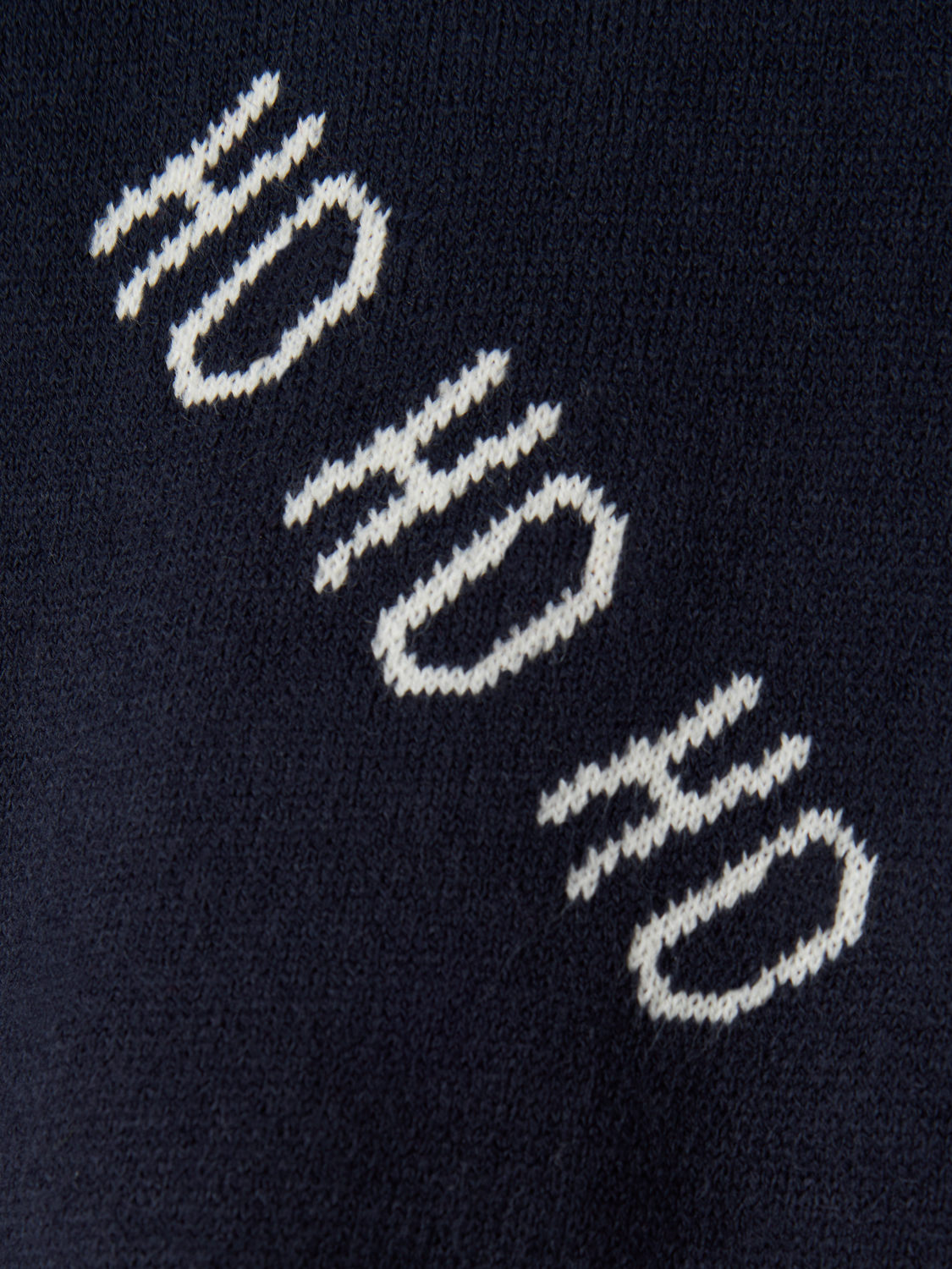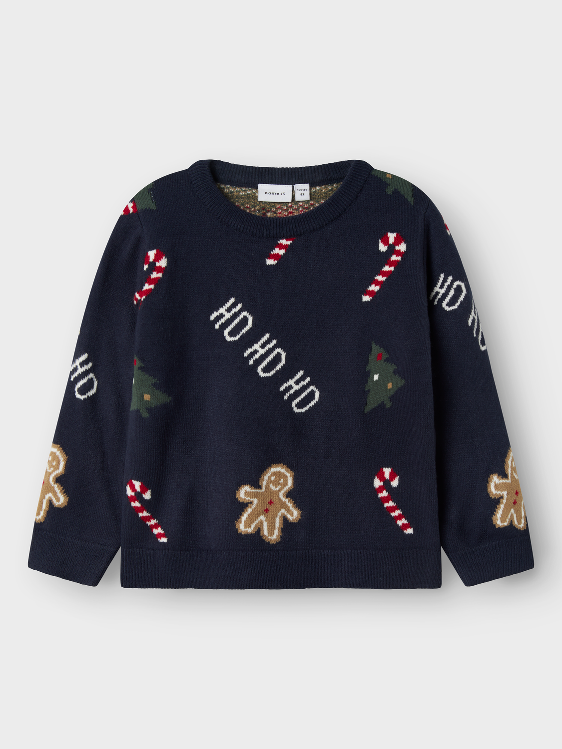 Gi barnet ditt en stilfull og komfortabel look med NMMRASKO LS KNIT BOX. Denne strikkegenseren i mørkeblått er perfekt for høytidene og gir en tidløs følelse med sitt detaljerte jacquardmønster.