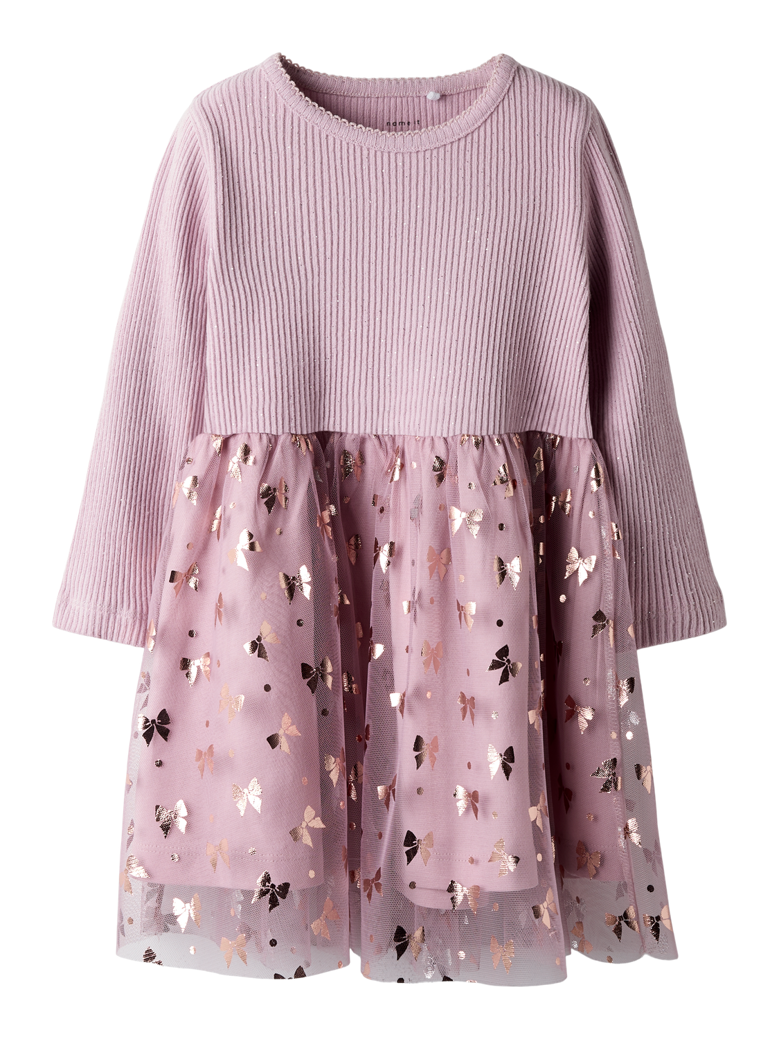 NMFROSALLY LS DRESS er en nydelig kjole i mellomlilla, perfekt for festlige anledninger. Den ribbestrikkede designen gir en tidløs stil og god elastisitet, noe som sikrer en behagelig passform for barnet ditt.